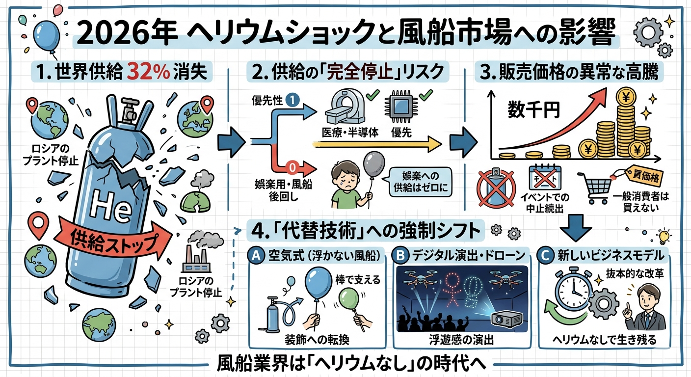 この2026年のヘリウムショックを受け、風船(イベント・玩具用)市場は過去最大の危機に直面しています。