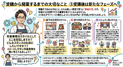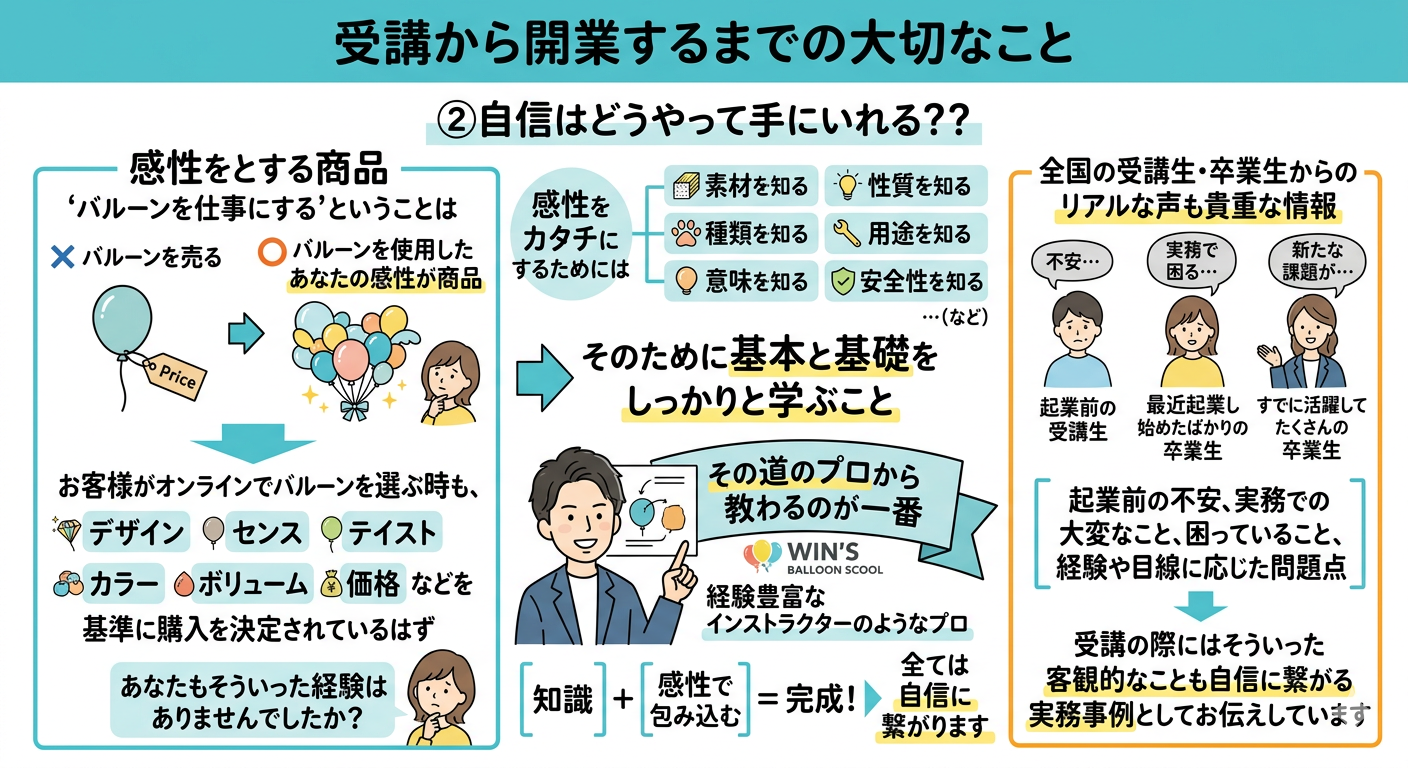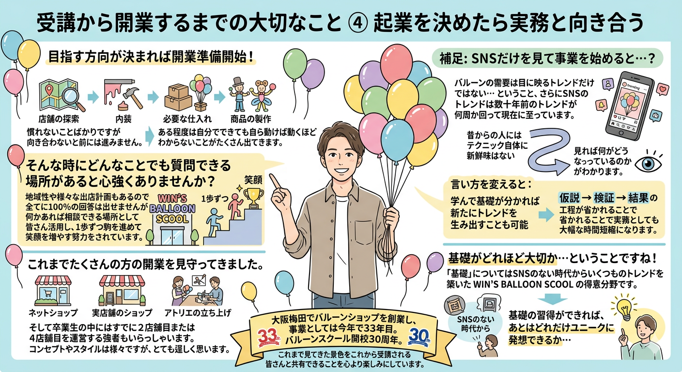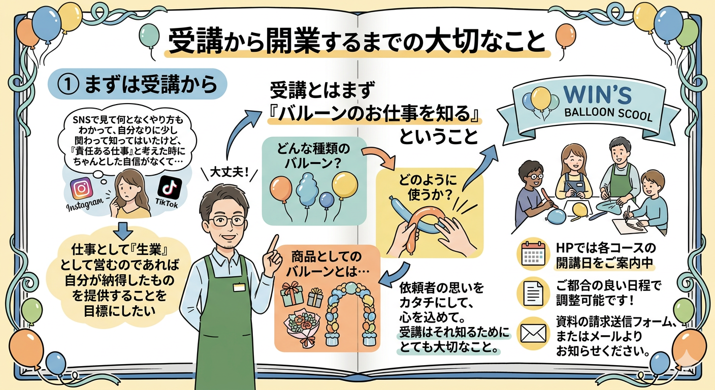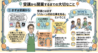 ウィンズバルーンスクール updated 2026-02-28 HOME | 受講から開業までグラレコ 受講から開業するまでの大切なこと ①まずは受講から タップで拡大表示されます HPでは各コースの開講日をご案内していますが、ご都合の良い日程で調整することも可能ですので、資料のご請求送信フォーム、またはメールよりお知らせください。 ②自信はどうやって手にいれる?? タップで拡大表示されます ③受講後は新たなフェーズへ タップで拡大表示されます ④起業を決めたら実務と向き合う タップで拡大表示されます